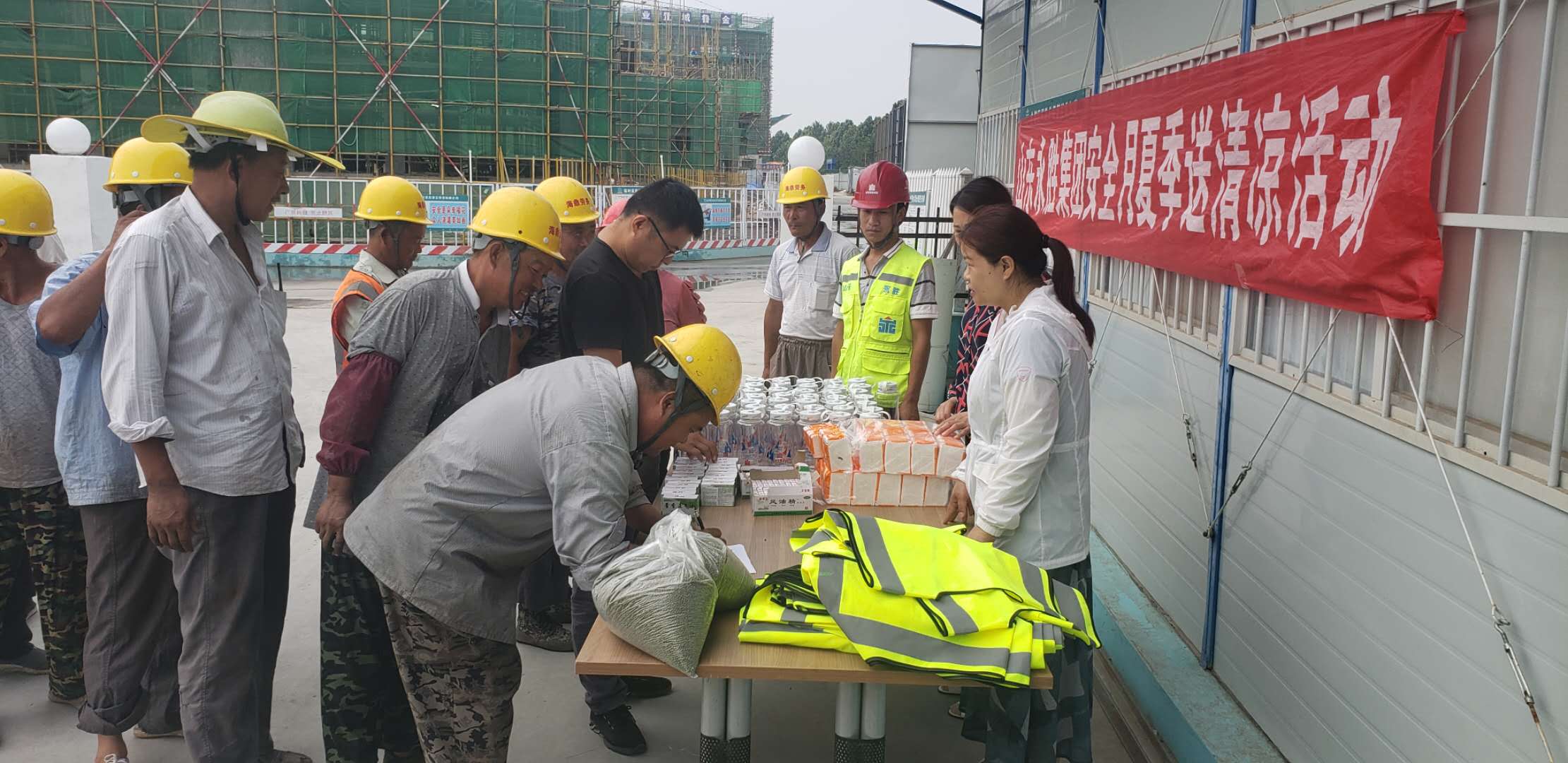 驕陽似火,酷暑難當(dāng)。隨著聒噪的蟬鳴,又迎來了今年的高溫季節(jié),為做好防暑降溫工作,保障施工一線員工和廣大農(nóng)民工的健康權(quán)益,推動改善員工生產(chǎn)生活條件,確保一線員工和廣大農(nóng)民工平安度夏。6月18日、19日,集團公司施工部,代表集團公司高管層和工會,分別到所有在建施工一線,為職工發(fā)放了防暑藥品、涼茶、水杯、綠豆、毛巾等防暑降溫物品1000余件,把清涼送到了施工一線。